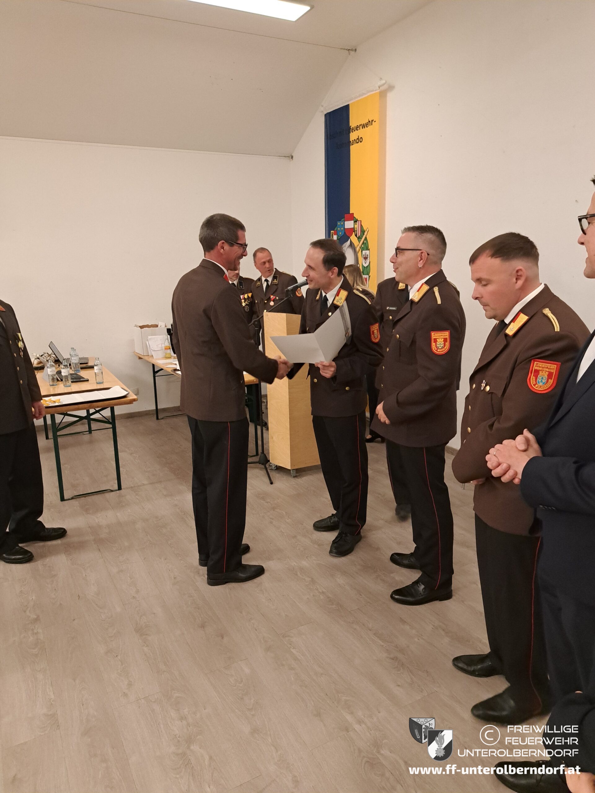Ein Höhepunkt des Abends für unsere Wehr war die Auszeichnung unseres ehemaligen Kommandanten Bernhard Böck. Aufgrund seiner langjährigen verdienstvollen Tätigkeit und seines besonderen Engagements im Feuerwehrwesen wurde er zum Ehrenhauptbrandinspektor ernannt. Sie stellt eine besondere Würdigung für Funktionäre dar, die sich über viele Jahre hinweg in führender Position verdient gemacht haben.