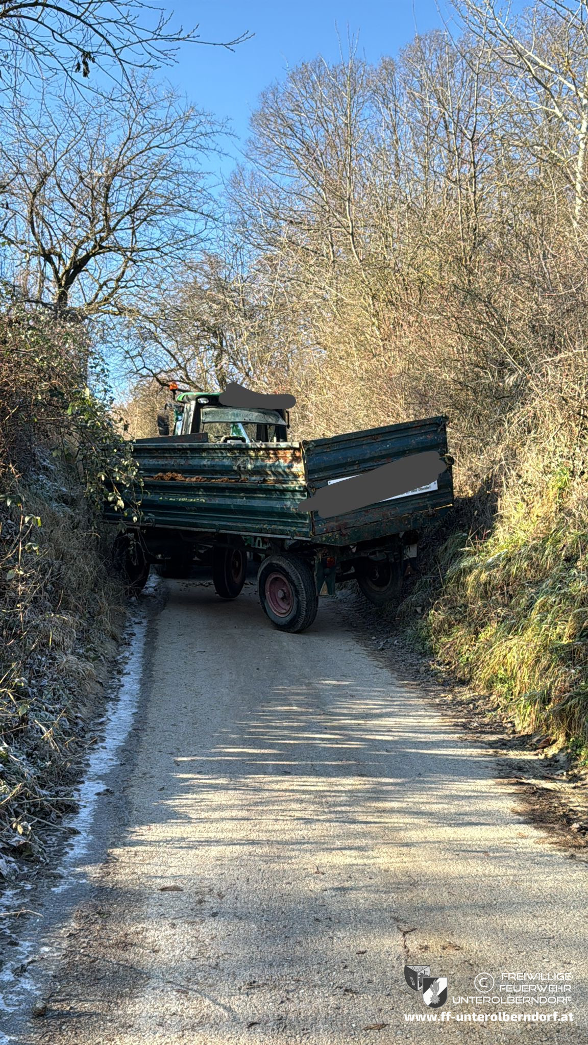 Am Einsatzort angekommen sicherten wir unser Einsatzfahrzeug mittels Windenkeilen und befreiten den Traktor mit Anhänger mithilfe der Seilwinde aus seiner misslichen Lage.